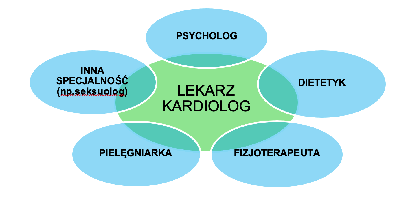 Koordynatorem zespołu opiekującego się pacjentem rehabilitowanym kardiologicznie jest kardiolog (przedstawia to Rycina 1). Współpracuje on z innymi specjalistami, jak fizjoterapeuta, psycholog, dietetyk, pielęgniarka czy np. seksuolog.